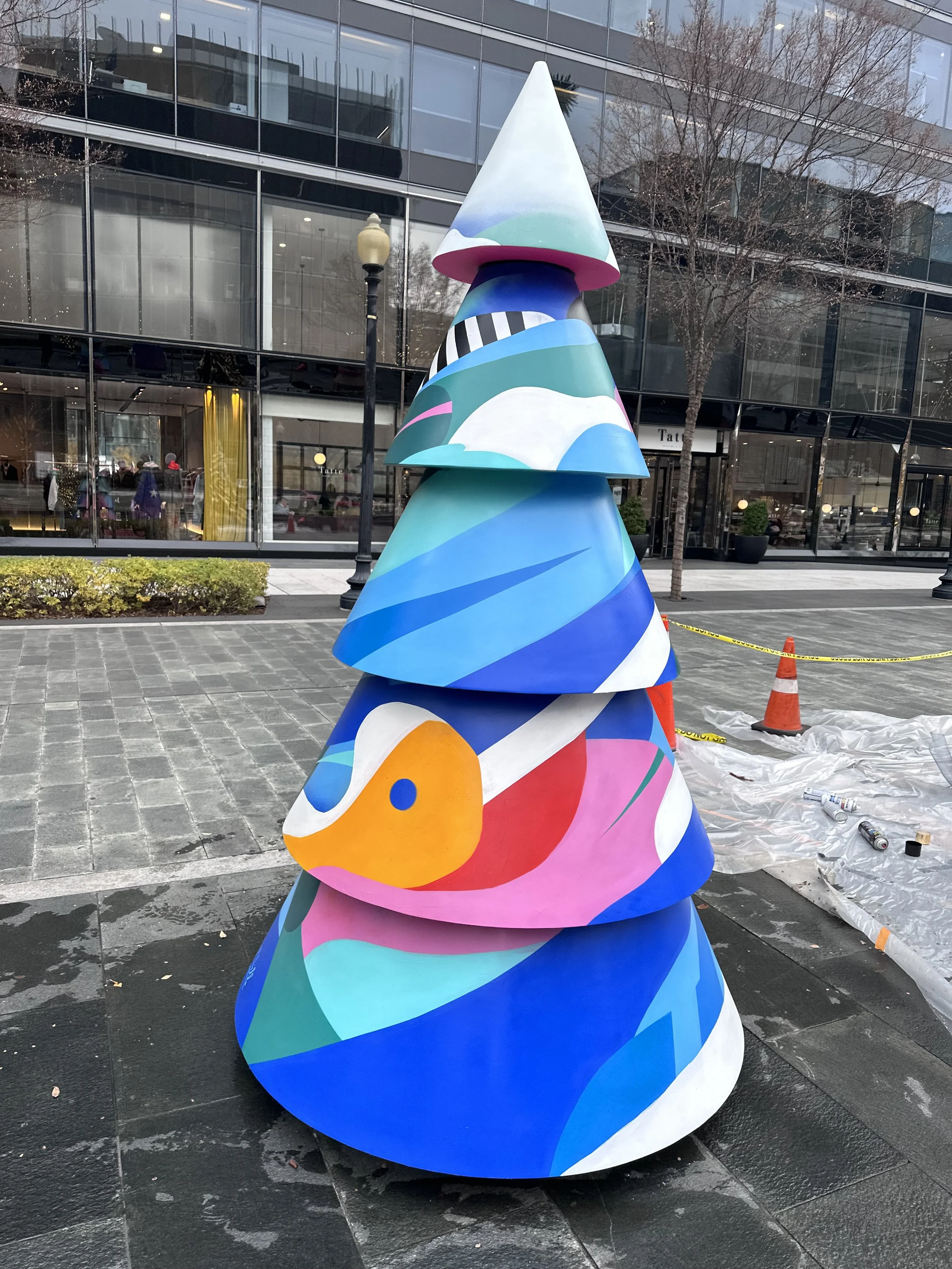 Haute for the Holidays SCULPTURE & Mural, was a concept of sculptural trees painted and designed to be part of a larger Christmas concept. This specific concept ties together curves and blades to help accentuate and exaggerate features.